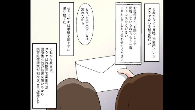 資産が3億円であることを娘婿に明かし、助けを求めてくる娘婿を突き放した主人公。 その後、娘は元気な女の子を産み、娘婿は詐欺罪で実刑判決を受けます。