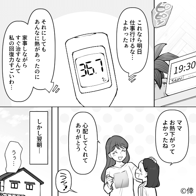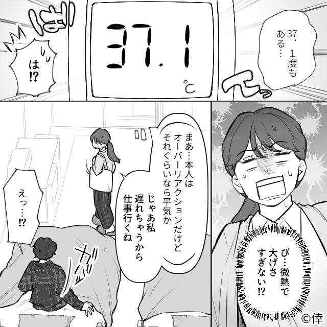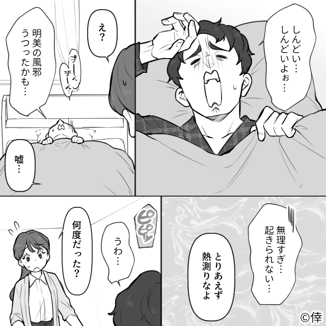 今回は『たった1回のゴミ出しで偉そうにする夫の話』を紹介します。 主人公が熱を出しても、家事に協力してくれない夫。 フラフラで家事をする主人公の横で、夫は動画を見て大笑いするのでした。