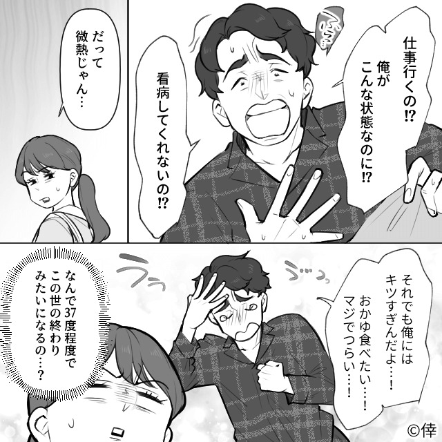 主人公の熱が下がった翌日、今度は夫が体調を崩してしまいます。 「しんどいよぉ」と苦しそうにする夫の熱を測ると微熱で、呆れた主人公は仕事に行くことに。
