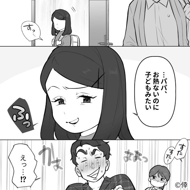 夫は「看病してくれないの!?」と必死に主人公を引きとめ、娘に「パパ、お熱ないのに子どもみたい」と笑われてしまうのでした。