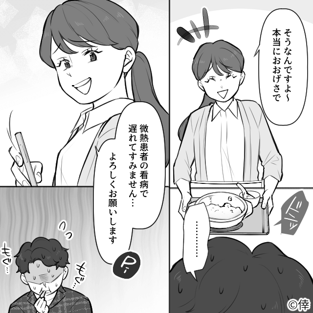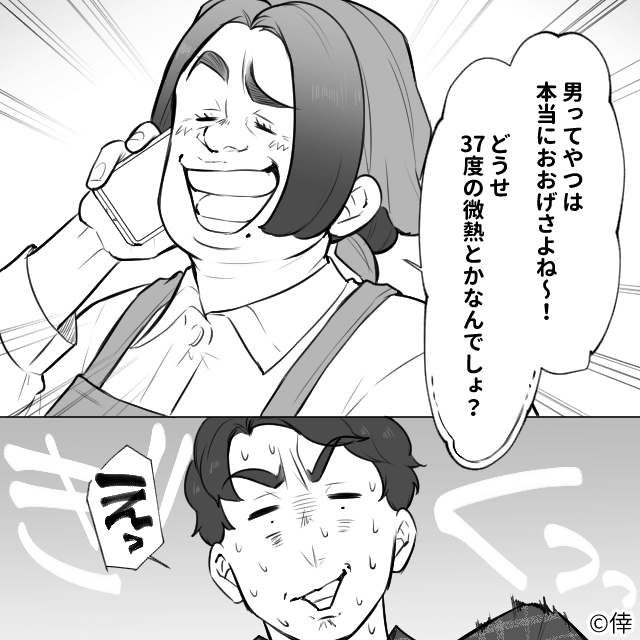 「本当にツラいんだってばぁ!」と泣く夫に「私38度でも家事やったんだけど!?」と激怒する主人公。 夫が必死に食事の用意をお願いしてくるため、主人公は職場の人に遅刻の電話をしながらおかゆを作ります。