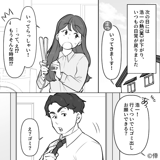 今回は『たった1回のゴミ出しで偉そうにする夫の話』を紹介します。 微熱で大騒ぎし、仕事に行こうとする主人公を引きとめた夫。 主人公の職場の人にも「男ってやつは本当に大げさよね〜」と笑われ、夫は恥ずかしい思いをしたのでした。