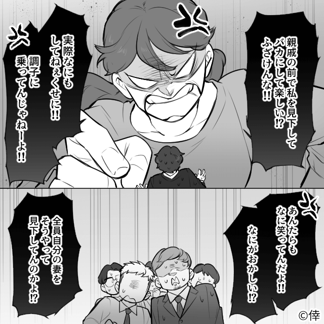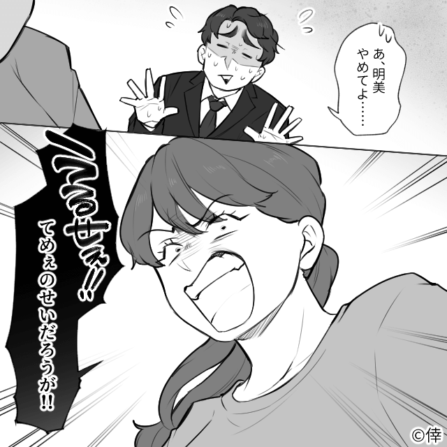 我慢の限界を感じた主人公は勢いよく扉を開き、激怒して夫に詰め寄ります。 夫は焦り「やめてよ…」と言うのですが、主人公は「てめぇのせいだろうが!」と言い返し…。