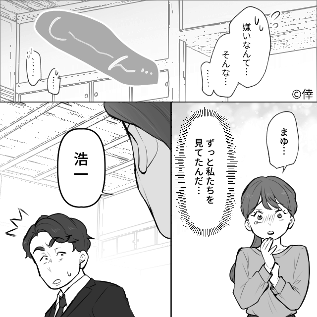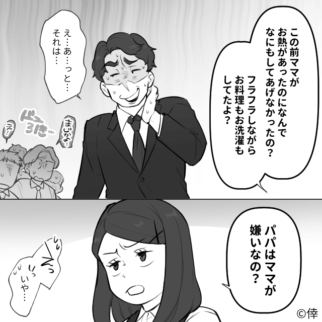 怒りが爆発し、涙が溢れてしまった主人公を見て、気まずそうに笑う夫。 そんな夫の態度にも主人公が怒りを感じていると、娘が「なんでさっきから嘘つくの?」と主人公を庇ってくれました。