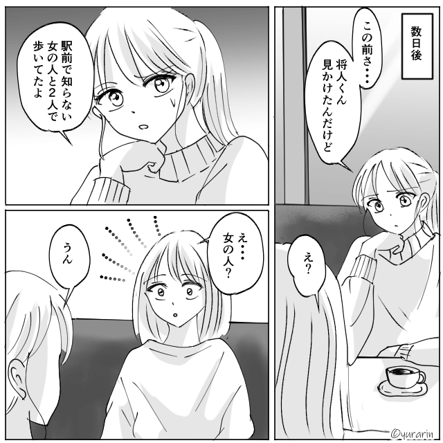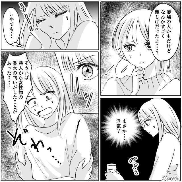 それから数日後、主人公は友人から夫が女性と親しそうに歩いていたと聞き、浮気を疑い始め…。