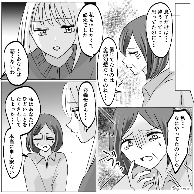 そんな義母は「息子だけは違うって思ってたのに…」とひどくショックを受けていて、すべてが幻想だったと気づいた義母は、今まで嫁いびりしていたことを主人公に謝罪してくれたのでした。