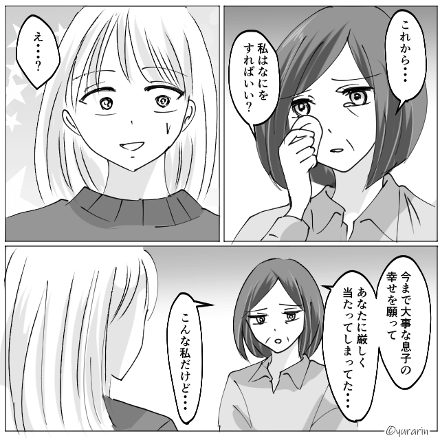 今回は『嘘つき浮気夫を“3人で撃退”した話』を紹介します。 「息子だけは違うって思ってたのに…」と、信じていたものがすべて幻想だったと気づいた義母。 目を覚ました義母は、今まで嫁いびりしていたことを主人公に謝罪してくれたのでした。
