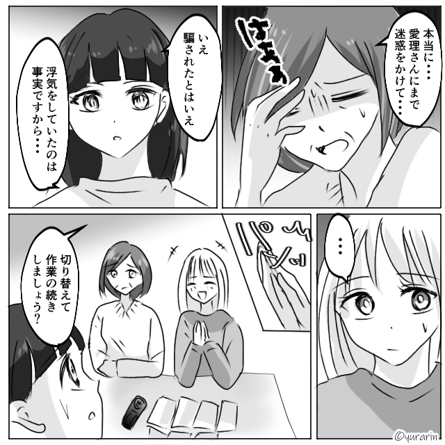義母と浮気相手と一緒に、浮気の証拠集めを進めた主人公。 浮気相手は夫のことがどうしても許せなかったようで、上司に夫との浮気を暴露しました。