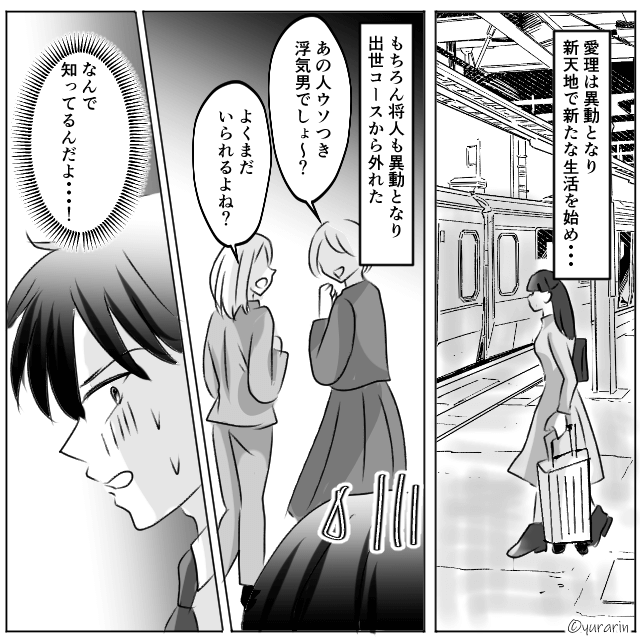 離婚後、浮気相手と会うものの、別れを告げられてしまった夫。 さらに夫は社内で白い目で見られるようになり、出世コースからも外れてしまいます。