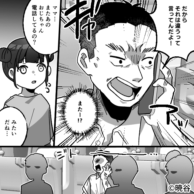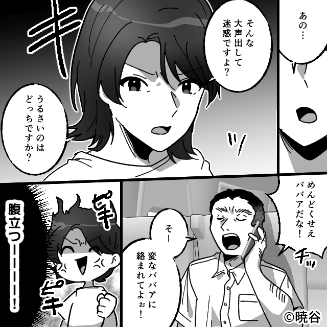 今回は『帰省中、迷惑すぎる人たちに遭遇した話』を紹介します。 新幹線の中で大声で電話をし、周囲に迷惑をかける男性。 そんな男性から「そのガキ静かにさせとけよ!」と言われ、主人公はイライラしてしまい…。