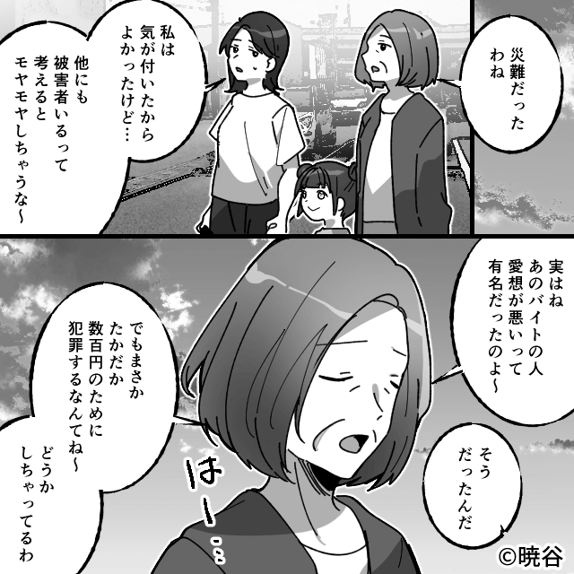 防犯カメラを確認して青ざめた店長は、主人公に謝罪。 どうやら店員は故意に会計の金額を上げ、その差額を盗んでいたようでした。