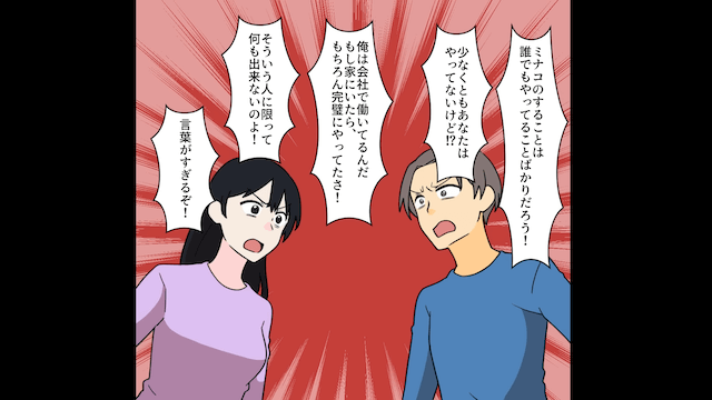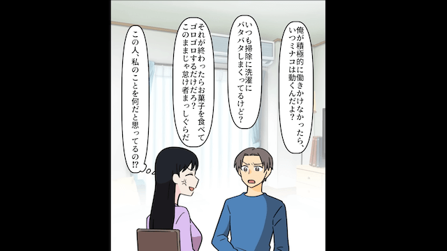 夫は主人公が普段動いていないと思い込んでいるようで、家事についても「誰でもやってることばかりだろう!」と感謝もなく…。