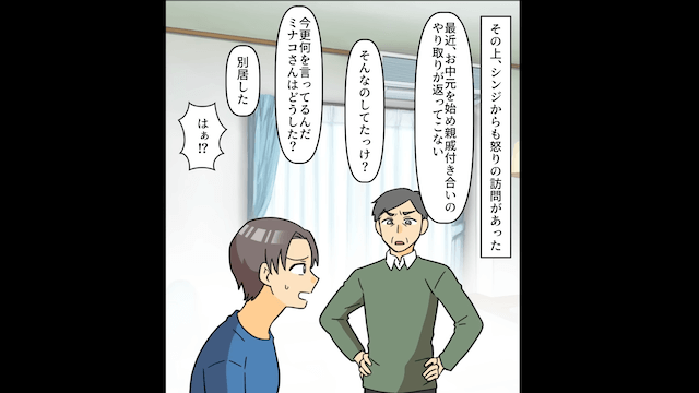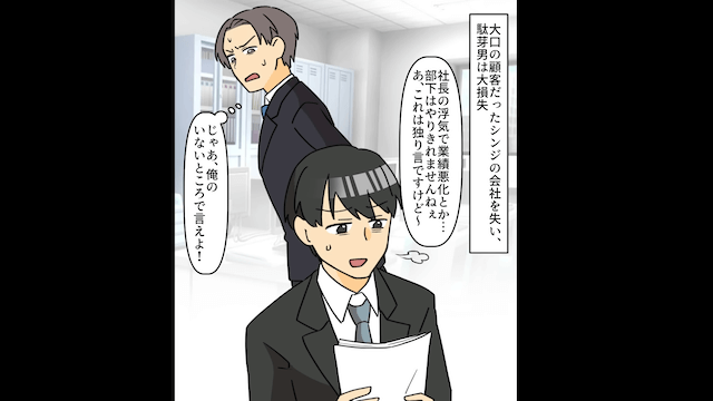 二重の生活費を払うことになった夫ですが、義母からも仕送りを頼まれて焦ります。 さらに叔父の会社との取引を中止されてしまい、夫の会社は大損失を受けてしまったのでした。