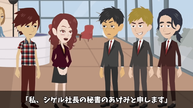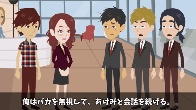 同級生はエントランスの車寄せに横づけされた主人公の高級車を見て、顎が外れるほど口を開けました。 そして同級生は、どうして主人公に秘書がいるのだと言いますが、主人公はそれを無視して秘書と会話を続けます。
