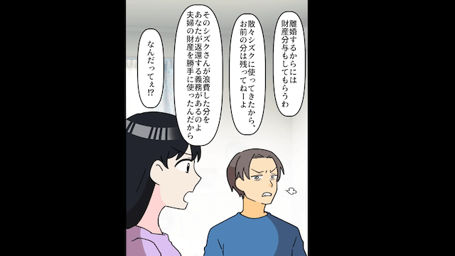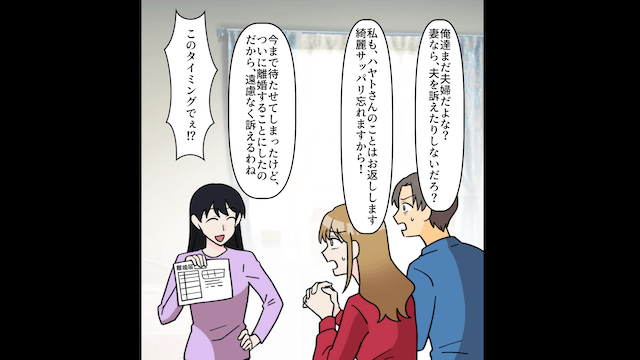 著作権法違反で訴えられることに焦った夫と秘書は、叔父や主人公に助けを求めますが、叔父は2人を冷たく突き放し、主人公は夫に離婚を突きつけます。 さらに主人公が夫に財産分与を求めて秘書に貢いだ分も請求すると告げると、夫は「証拠はないだろ?」と言いました。