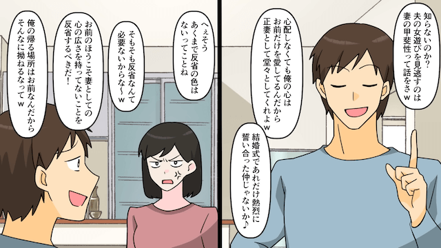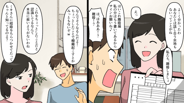 ある日、主人公は夫に浮気の証拠を突きつけ、浮気相手本人から写真が送られてきたことを伝えました。 しかし夫が浮気を反省せず開き直ったため、主人公は離婚を突きつけ、夫の言動が詐欺行為にあたると説明したのです。