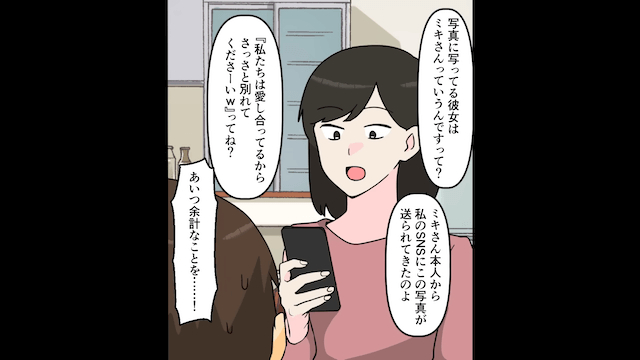 ユカリ 「写真に映ってる彼女はミキさんって言うんですって。ミキさん本人から私のSNSにこの写真が送られてきたのよ。『私たちは愛し合ってるからさっさと別れてください』ってね。」