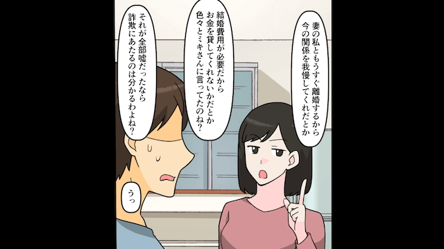 ユカリ 「今の関係を我慢してくれだとか、結婚費用が必要だからお金を貸してくれないかだとか、色々とミキさんに言ってたのね。」これが全部嘘だったなら、詐欺に当たるのは分かるわよね。」
