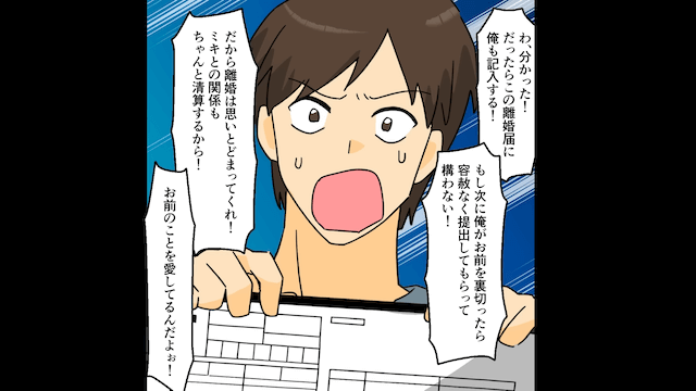 ミツル 「分かった。だったらこの離婚届に俺も記入する。もし次に俺がお前を裏切ったら、容赦なく提出してもらって構わない。だから離婚は思いとどまってくれ。ミキとの関係もちゃんと清算するから。お前のことを愛してるんだよ。」
