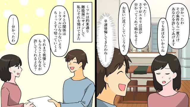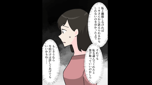 ユカリ 「私と離婚しなければミキさんから訴えられるかもしれないのを分かった上で、それでも私を選んでくれたと受け取っていいのかしら?もしそうなら、許してあげてもいいかもね。」