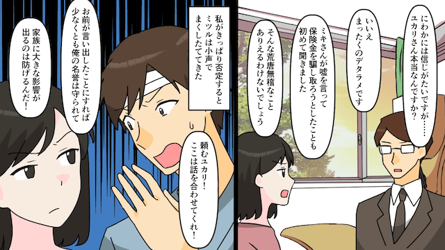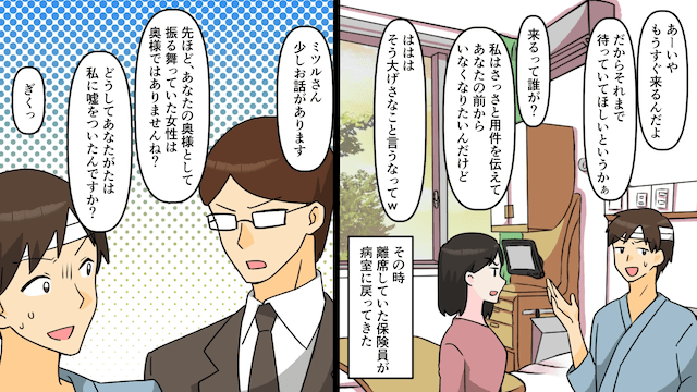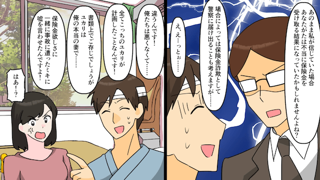 保険金詐欺の片棒を担いで動揺する夫のもとに、再び保険外交員がやってきました。 すでに浮気相手の嘘はバレており、焦った夫はすべて主人公が計画したことだと言い、主人公に話を合わせるよう頼みます。