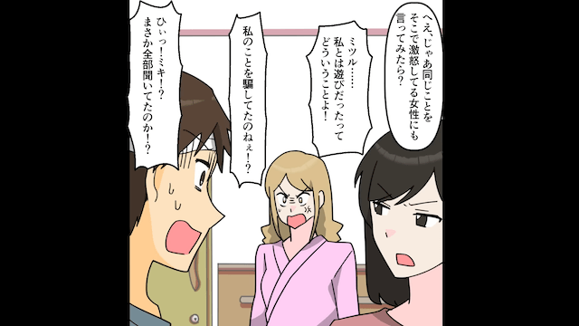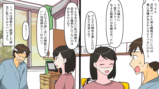 主人公がすでに離婚届を提出したことを告げると、夫は浮気相手と結婚するつもりはないと言い、主人公にすがりついてきました。 するとその話を近くで聞いていた浮気相手が激怒して…。