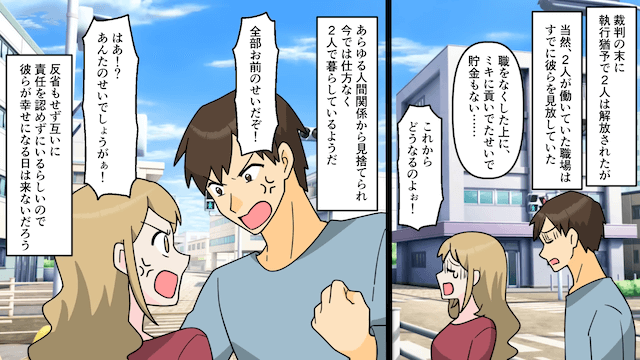 夫の本音を聞いて反撃を決意した浮気相手は、夫の借金を主人公に暴露。 主人公は両親とともに夫と浮気相手を訴えますが、2人が交渉に応じなかったため、警察沙汰にしました。
