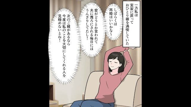 その後、夫と浮気相手は仕事と貯金を失い、主人公は実家に戻って自分の人生を満喫するのでした。