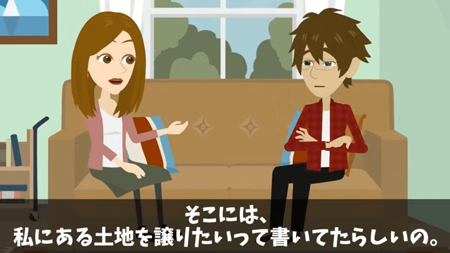 妻は亡くなった叔父の土地を受け取ることになったと主人公に伝えます。 そして、そのことについて弁護士と話し合いがあるから主人公についてきてほしいと言いました。