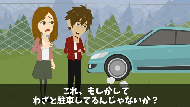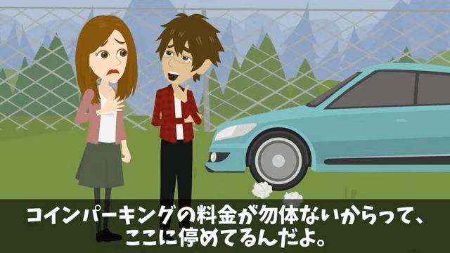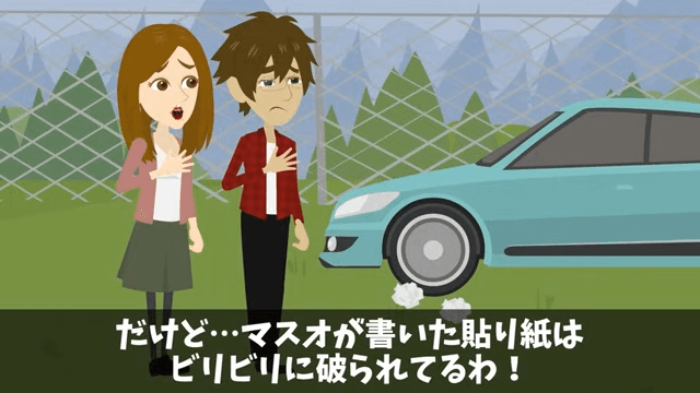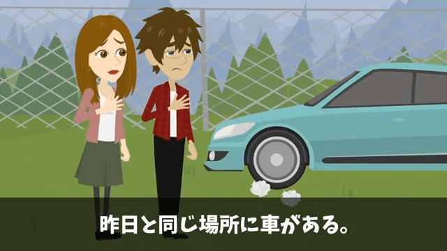 昨日と同じ場所に車があり、主人公が書いた張り紙は破られていました。 それを見た主人公は、コインパーキングに払うお金がもったいないからここに駐車しているのだろうと考えます。