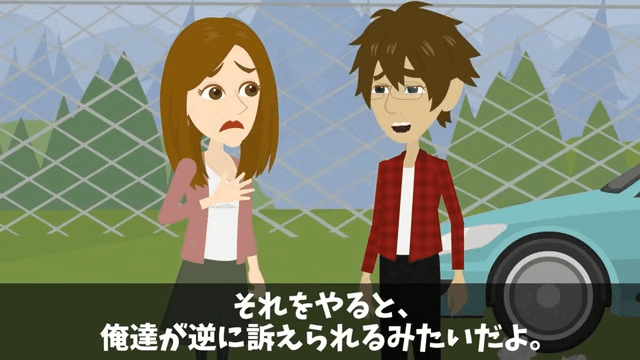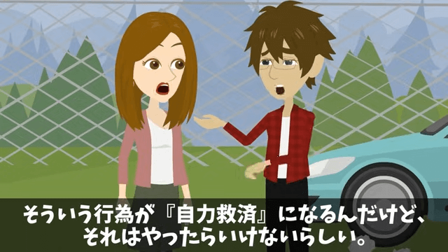 主人公は法律に自力救済禁止の原則があることを妻に伝えます。 そして無断駐車の車を自分たちでどかすことはできないと説明しました。