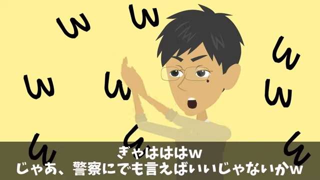 妻が「そんなことしていいと思ってるの?」と言うと、男性は「じゃあ、警察にでも言えばいいじゃないか」と言って笑います。 それに対し妻が言葉を詰まらせていると、男性は「おっ。その顔は、もうとっくに警察に連絡したって感じだな」と言いました。