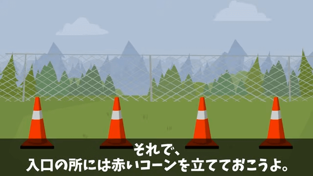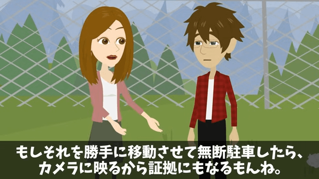 主人公は敷地内に防犯カメラを設置し、入口には赤いコーンを立てておくことを妻に提案します。 それを聞いた妻は「もしそれを勝手に移動させて無断駐車したら、カメラに映るから証拠にもなるもんね」と言いました。