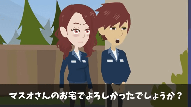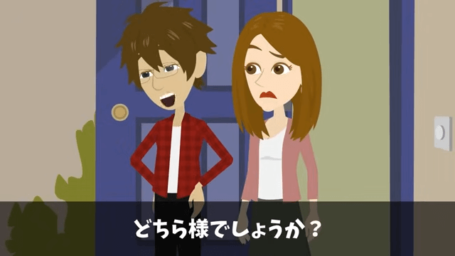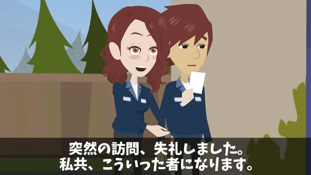 ある日、主人公の家に男性社員と女性社員が訪ねてきました。 そこで主人公が「どちら様でしょうか?」と尋ねると、女性社員が主人公に名刺を渡します。