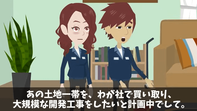 女性社員は妻が所有している土地を売ってほしいと言いました。 そして今、大規模な開発工事のためにあの土地一帯を買い取っていることを説明します。
