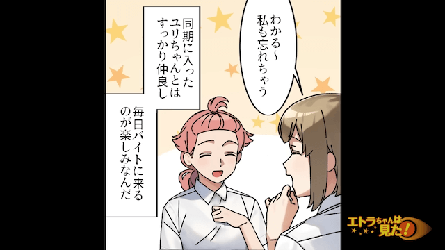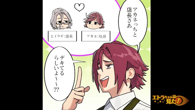 バイト先で気軽に話せる友人もでき、楽しく働いていた主人公。 そんなある日、先輩が「あの話聞いた〜?」と言い、店長と女性社員が恋愛関係にあるという噂を話してきて…。