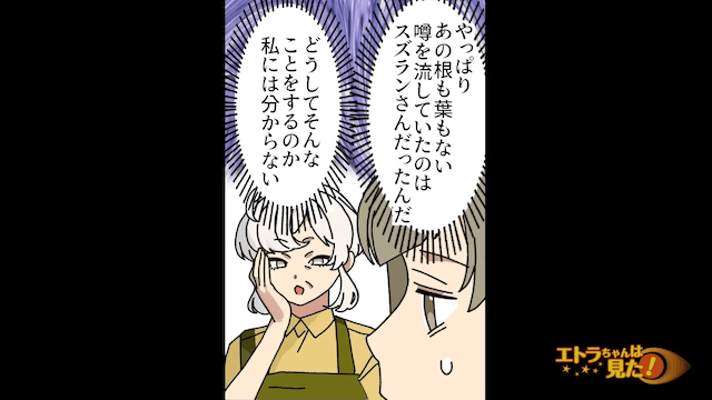 今回は『職場で悪い噂を流すお局の末路』を紹介します。 直接話し合った結果、お局の話が嘘だったと気づいた主人公と友人。 主人公は「ちゃんと話せてよかった」とホッとして…。