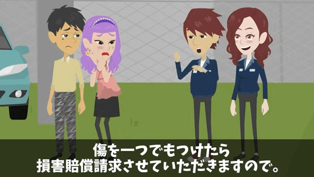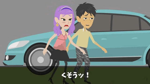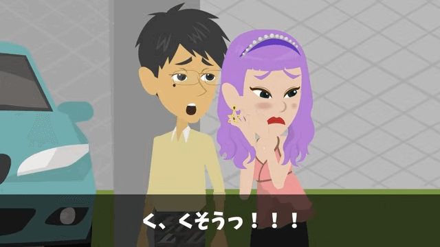 男性社員は建物に傷をつけたら損害賠償請求をすると男性に伝えました。 それを聞いた男性は「く、くそうっ!」と言って、慎重に車に乗り込もうとします。