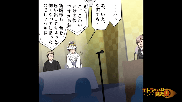 幸せそうな友人と新郎が入場したあと、参列者が友人代表のスピーチをしました。 参列者は友人と肝試しに行ったときの思い出を語ったのですが、スピーチが終わった瞬間、青ざめた友人が突然席を立ちます。