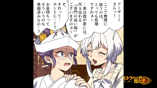 取り乱しながらも目が据わった友人を見て、あることを思い出した主人公。 そして主人公は「実は我が家には代々伝わる専門の祓い場がございますのよ〜」と友人に告げ、運転手を呼び出して…。