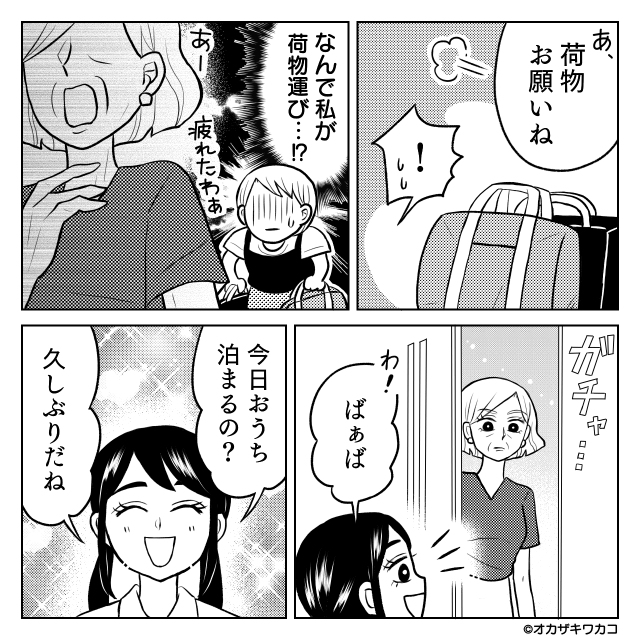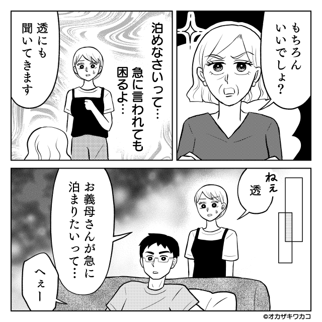 今回は『娘を邪険に扱う義母を撃退した話』を紹介します。 旅行がキャンセルになったようで、アポなしで家にやってきた義母。 威圧的な態度をとる義母は「台風おさまるまで泊めなさい!」と身勝手な主張を始め…。