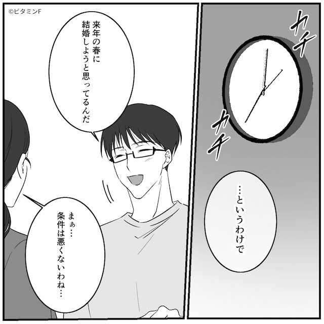 「奪うなんて許さないわ!ママの宝物なのに!」と義母に言われ、夫がマザコンだと知って驚愕する主人公。 なんとか結婚挨拶を終えると、義母は「条件は悪くないわね…」と渋々結婚を許してくれました。
