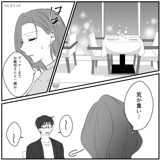 新婚旅行で義母を優先し、主人公のことをほったらかしにする夫を見て、離婚を決意した主人公。 ディナーまで義母と一緒だったため主人公がうんざりしていると、隣の席から大きな声が聞こえ…。