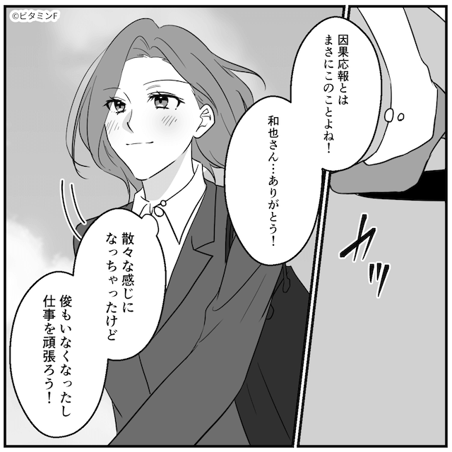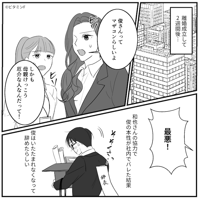 その後、同僚の協力もあって夫の本性は会社で噂となり、夫は自主退職をしたのでした。