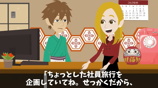 社長は主人公に社員旅行を企画していることを伝えます。 そして社長は、主人公の高級旅館に泊まらせてもらえないかと言いました。