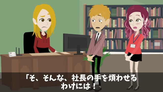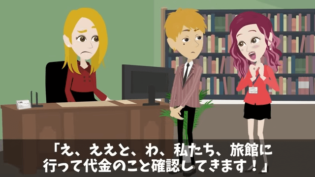 まさかの事実を知った元同僚は「わ、私たち、旅館に行って代金のことを確認してきます!」と言いました。 それを聞いた社長が「ううん、私が行くから大丈夫よ」と言うと、元上司は「そ、そんな、社長の手を煩わせるわけには!」と慌てます。