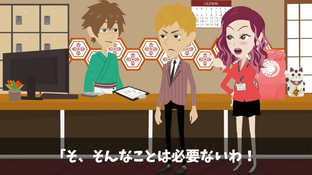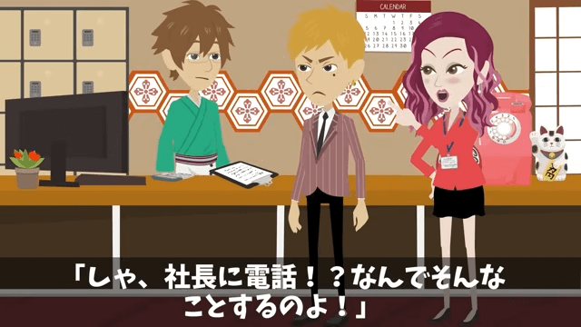 再びやってきた元上司と元同僚に、主人公は今確認の電話をしようとしていたところだと伝えました。 それを聞いた元同僚は「しゃ、社長に電話!?なんでそんなことするのよ!」と慌てます。