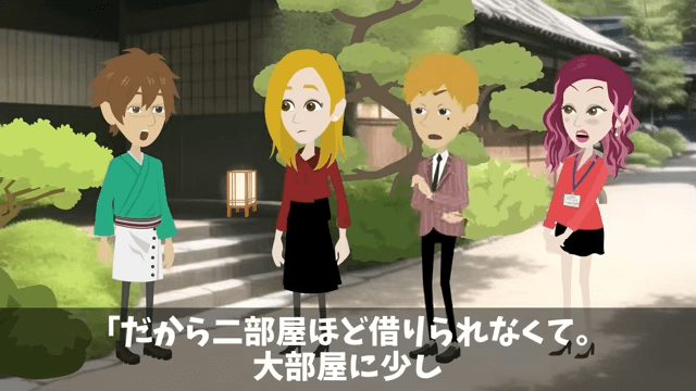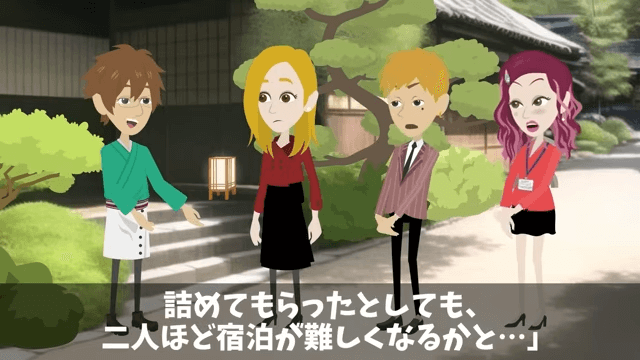 主人公は反省していない様子の元上司と元同僚に呆れつつ、すでに予約を2件入れてしまったことを社長に伝えます。 そして、大部屋に詰めてもらっても2人ほど宿泊が難しくなると話すと…。