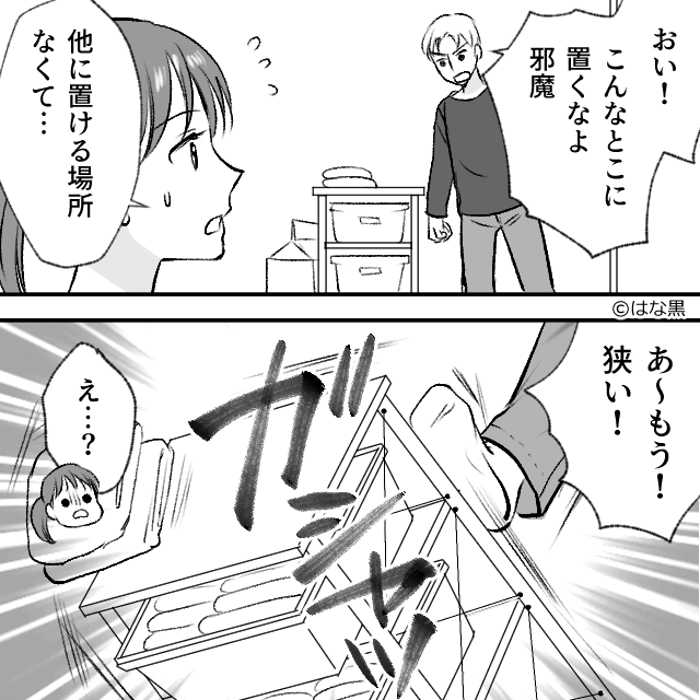 ひどい態度をとる夫は医者に注意され、結局追い出されてしまいました。 そして退院後、夫は部屋に置いていた棚を「こんなとこに置くなよ、邪魔」と言って蹴り飛ばし…。
