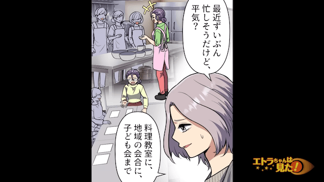 料理教室で出す試作品を夫に食べてもらい、褒めてもらった主人公。 最近の主人公は料理教室や地域の会合など、毎日忙しく活動していました。